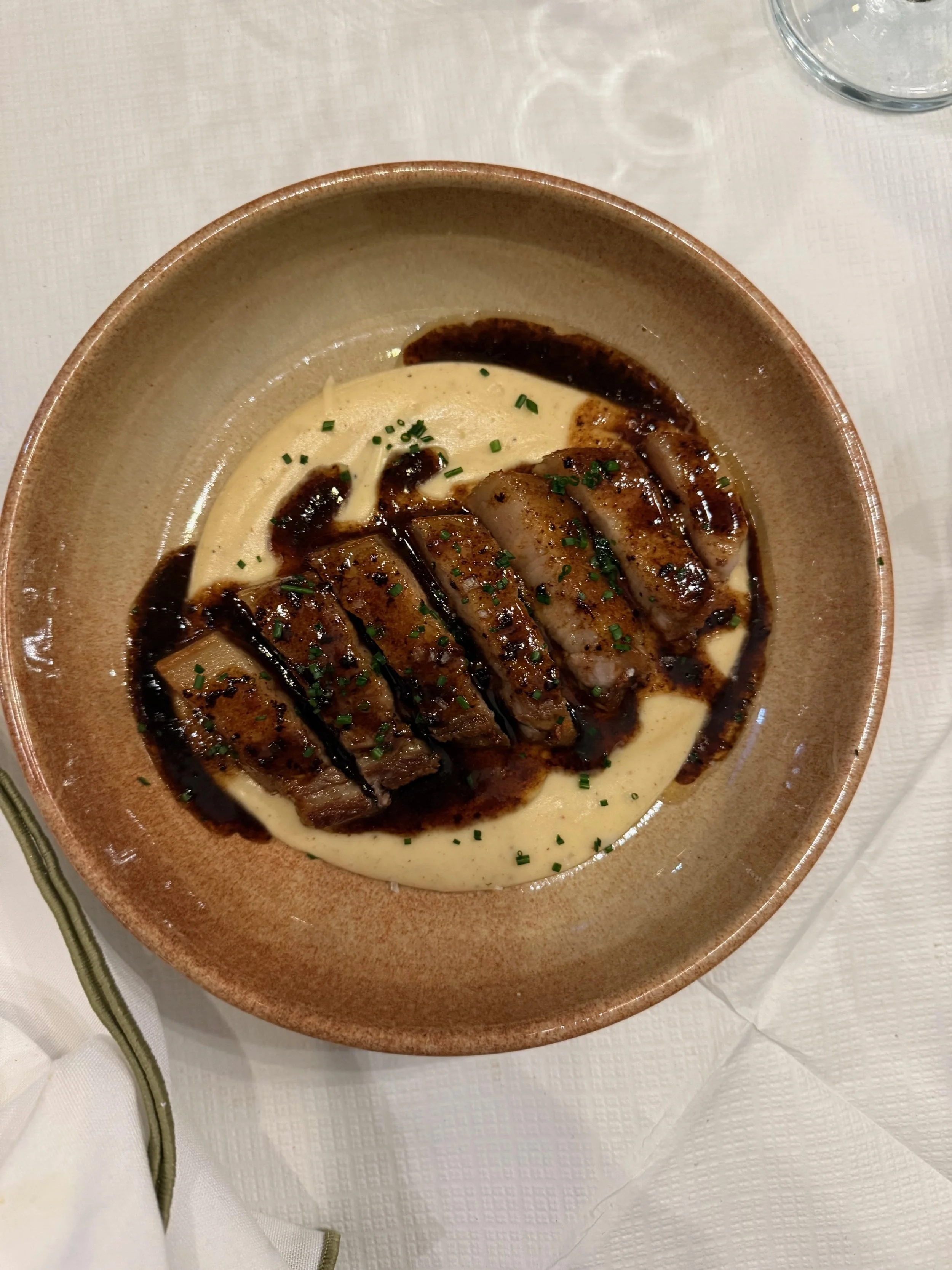 Roasted belly of pork with red wine demiglace on parsnip parmentier
