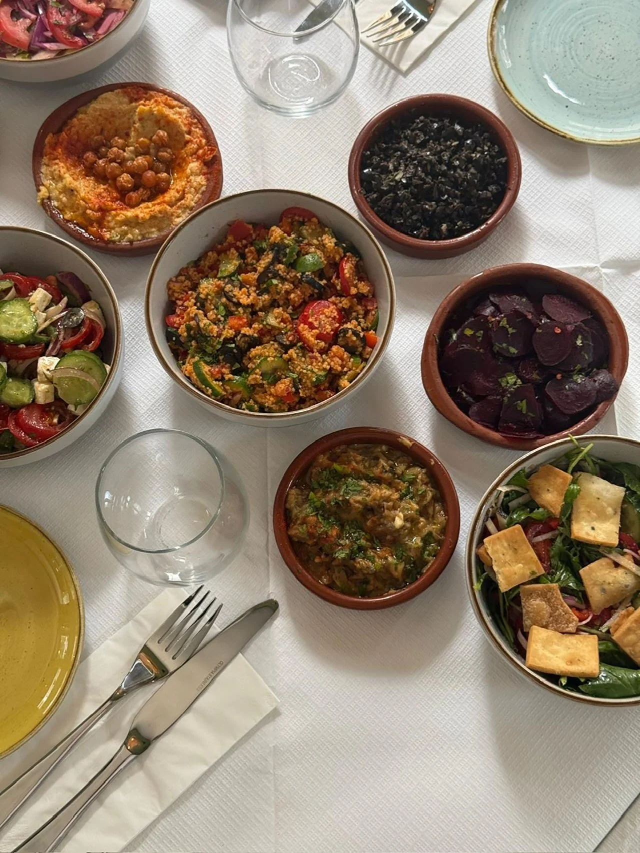 An assortment of Mediterranean dishes on a white tablecloth, including salads, hummus, roasted beets, black tapenade, and grain bowls, with some empty plates, glasses, and cutlery.