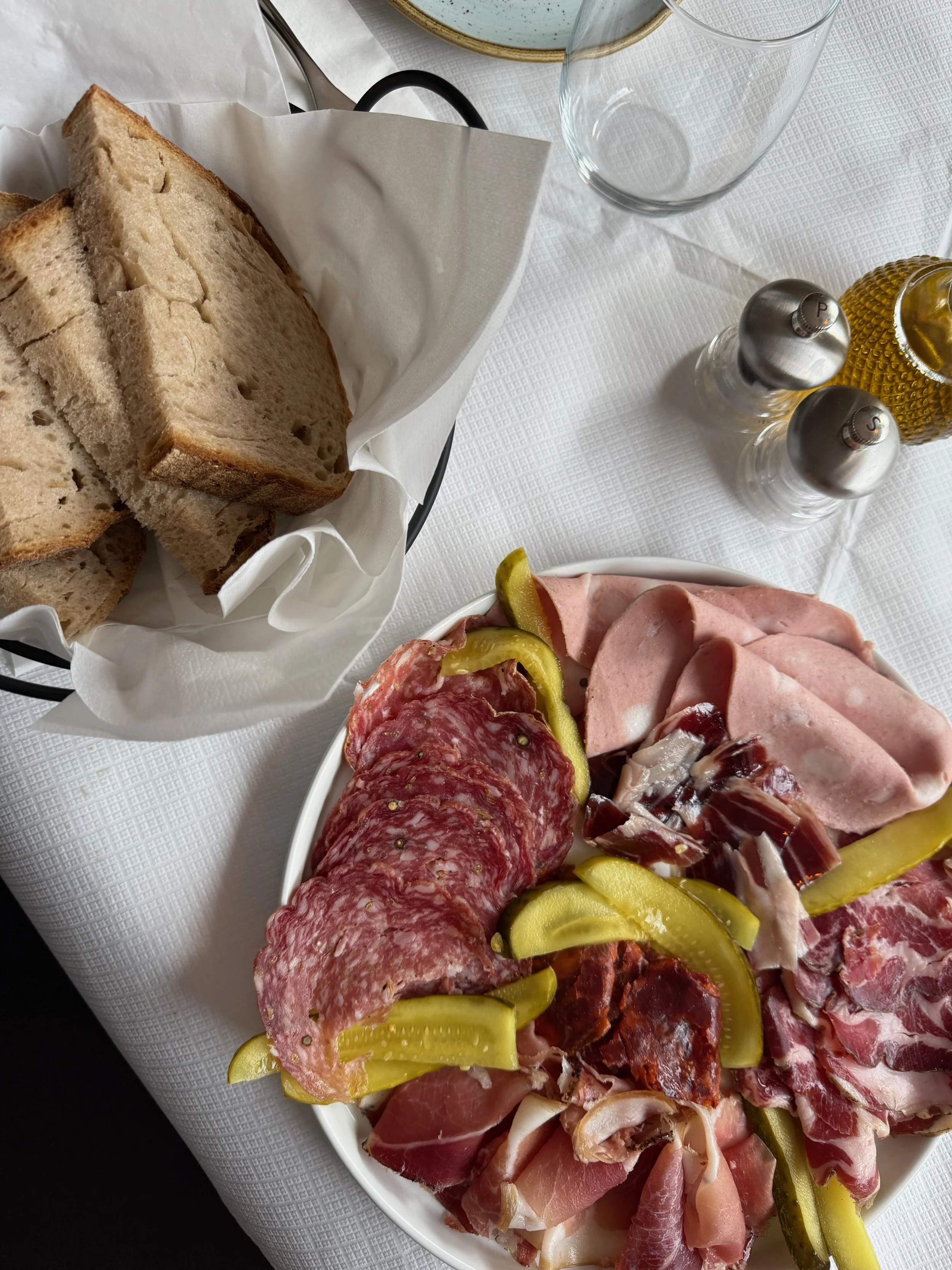 Basket of sliced bread, glass of water, salt and pepper shakers, bottle of olive oil, and a bowl of assorted cured meats including salami, ham, and prosciutto, on a white tablecloth.