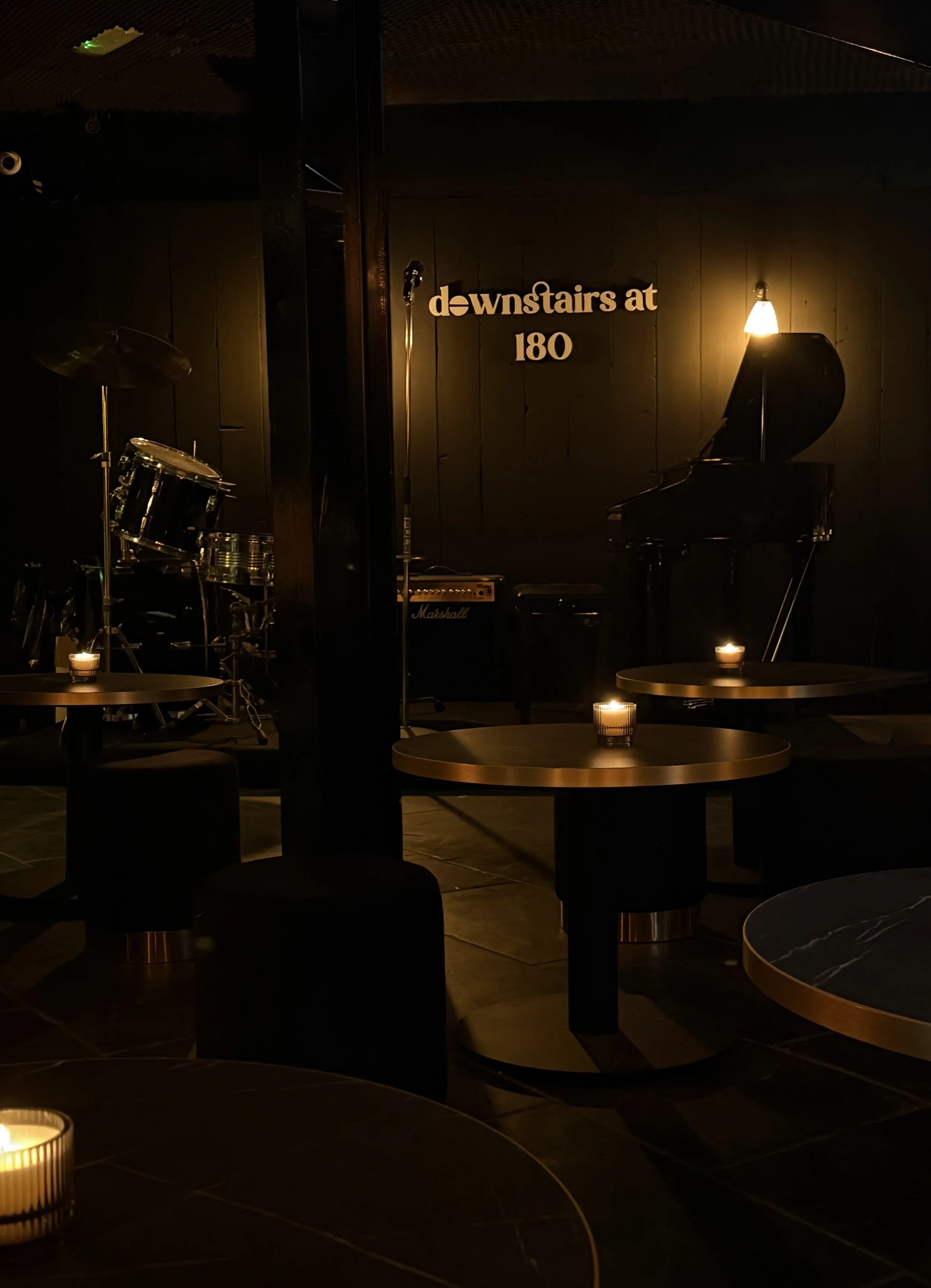 Dimly lit music venue with tables, candles, and musical instruments on stage, including drums and a piano, with a sign that reads 'downstairs at 180' on the wall.