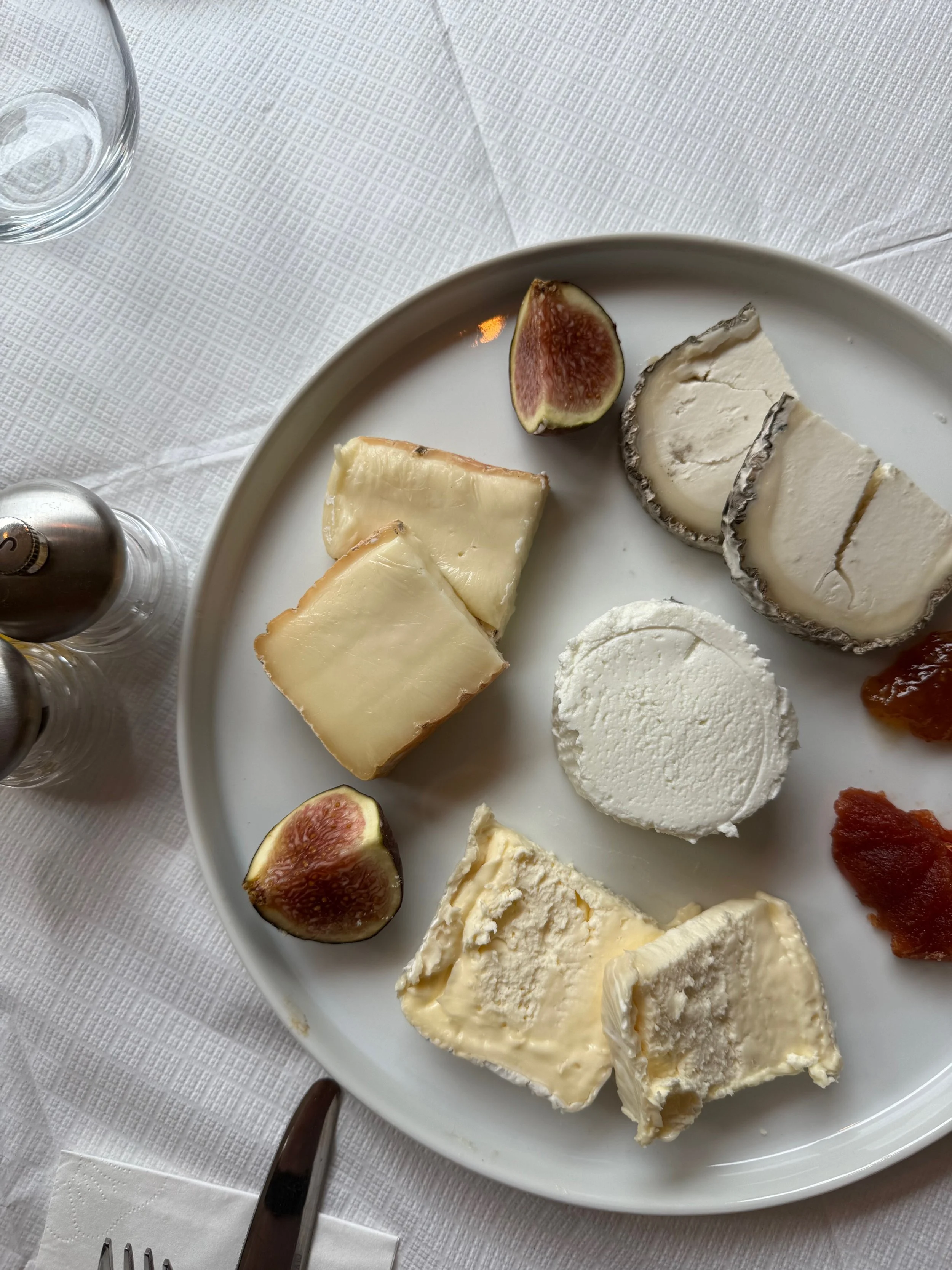 Cheese platter with four types of cheese, fresh figs, and some fruit preserves on a white plate.